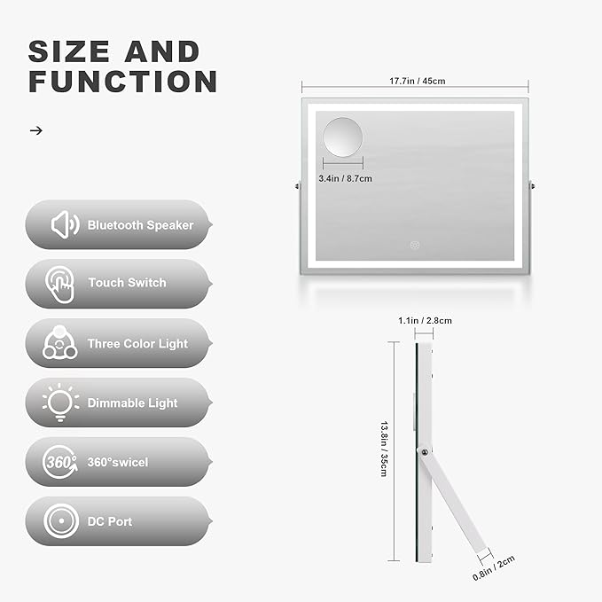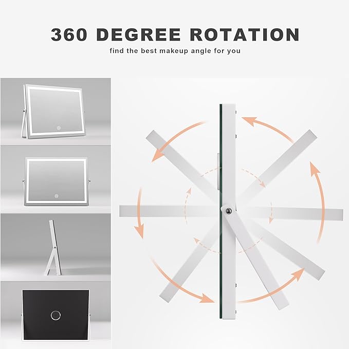 - ๐ใ๐๐๐ยฐ๐๐จ๐ญ๐๐ญ๐ข๐จ๐งใ360 degree free rotation can allows you to place this lighted make up mirror swiveled to each side easily and help you allows you to see more detail, convenient for you to select the best angle or position.