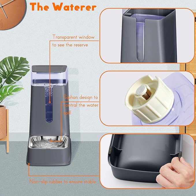 - Automatic Refills Food And Water With Gravity System: The gravity automatic dog feeder is design with self-gravity feeding, no electricity required. There are four non-slip rubber feet on the bottom of the cat feeder to ensure safe placement and suitable for both indoor and outdoor use. The automatic cat feeder is the best choice if you need to go to work or travel, do not need to worry about your pets being hungry or thirsty