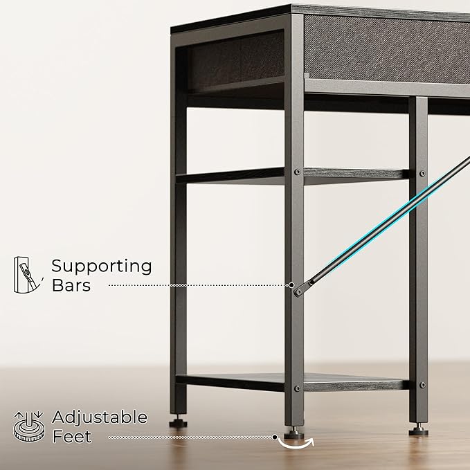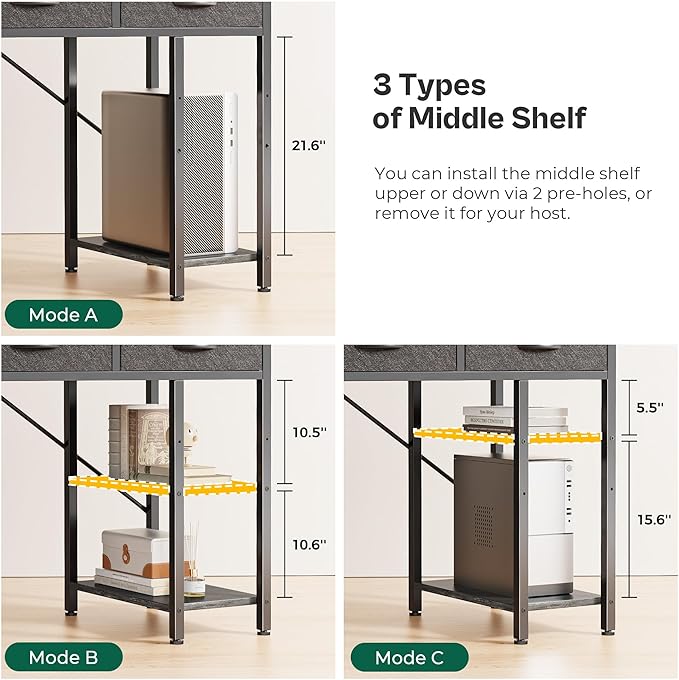 - 【Reversible Design & Adjustable Shelf】You can choose to install the fabric drawers on either the left or right side, making this writing desk adaptable to your space. With 2-level pre-drilled holes for the middle shelf, you can adjust its height to hold tall or short items or remove it entirely to accommodate your host. This flexibility allows you to create a work space that’s perfect for your needs