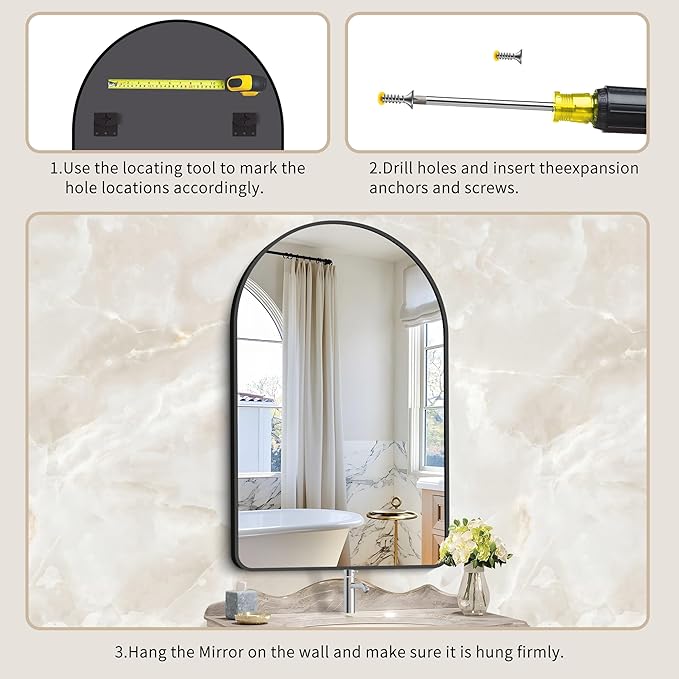 - HD Explosion-proof Glass: GLASHOM arch mirrors for wall is made of premium explosion-proof membrane glass so that it's safer for you and your family.Aluminum alloy frame which is anti-rust, and also the metal-framed mirror is with explosion-proof membrane built-in which ensure the mirror being safely and securely for using. The wall-mounted mirror for the bathroom performs beautifully in every climate.