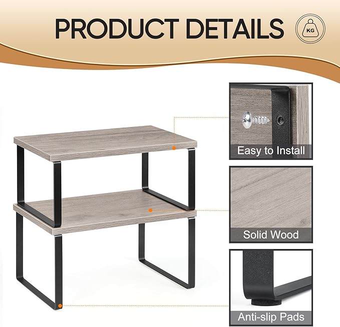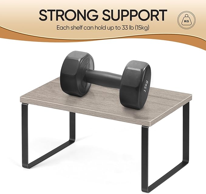 NEX Kitchen Cabinet and Counter Shelf Organizer, Shelf Riser for Pantry Countertop Cupboard Desk Top, Stackable & Expandable, Set of 4, Black and Greige