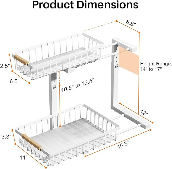 - 5 Levels Height Adjustable: Kitchen organizers and storage feature a practical design with 5-level of height adjustability, the height can be adjusted from 14 inches to 17 inches, suitable for the height of cabinets and items