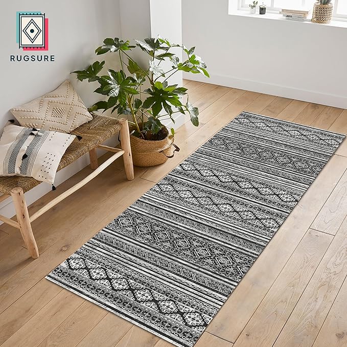 RUGSURE Washable Area Rugs 2'6'' x 8' - 1/6 Thick - Moroccan-Inspired -Stain & Water Resistant Non-Slip - Resistant Rug for Living Room, Bedroom, Nursery, Pet & Child Friendly (Black)