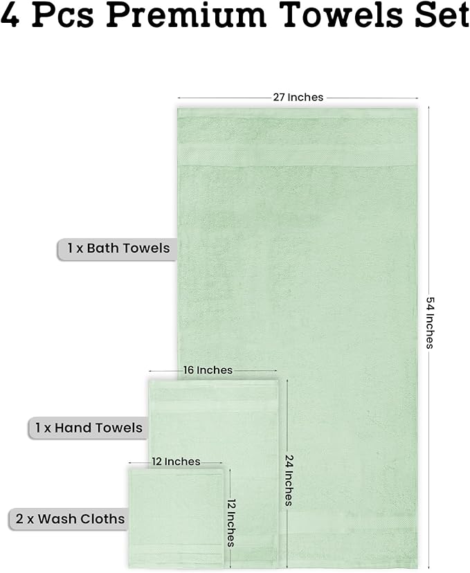 Casa Lino 100% Cotton Bath Towels Set of 4 (1 Bath Towel, 1 Hand Towel & 2 Wash Cloths) - Bathroom Towels and Washcloths Set - Complete Bathroom Set - Guest Room Essentials - (Light Sage Green)
