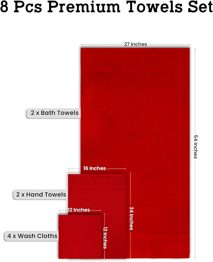 Casa Lino Bath Towel Set of 8 (2 Bath Towels, 4 Wash Cloths & 2 Hand Towels for Bathroom) - 100% Cotton - Highly Absorbent & Quick Dry - Guest Room Essentials for Bathroom Set - (Red)