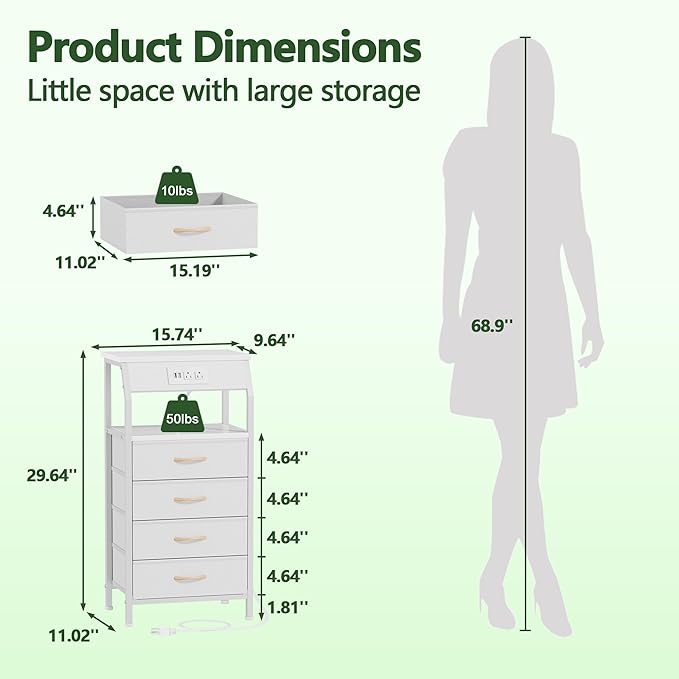Furnulem Night Stand with Charging Station, Dresser with PVC & Fabric Drawers, 33.3 Inch Side Table with Open Shelf, Tall Bedside Table for Closet, Entryway, Bedroom Furniture, 3 Ways to Use, White