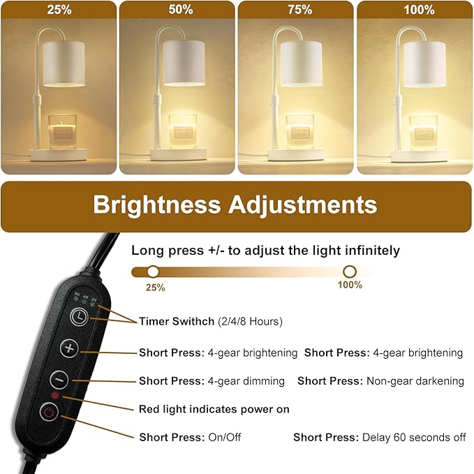 - 【Temperature Adjustment】 For this candle warmer, you can increase or decrease the temperature through theaugmented symbols and reduced symbols of the button, the higher the temperature level, the higher the degree of heating. Lower the lampshade closer to the candle, accelerating wax melting and intensifying fragrance release. With this thoughtful design, you control the candle’s burn rate, extending its lifespan and maximizing savings.