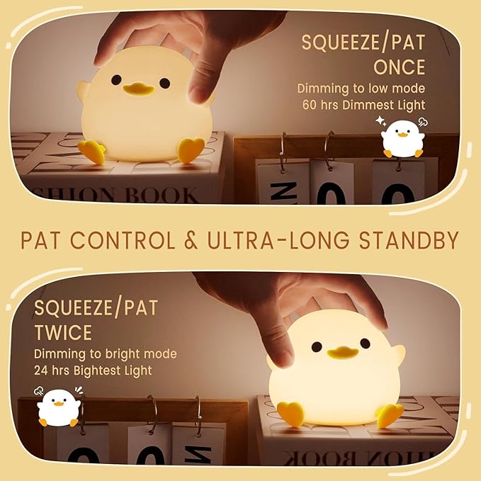 - šš¢š¦š¦ššš„š šš®šš¤ šš®šš ššš¦š©š¬: You can touch the lovely ducky night lights with 20 minutes timer choice, no need to manually shut it off. 2 levels different brightness settings: You can tap the dodo duck body to adjust the brightness of this cute lights in the weak and normal gear. Warm and soft lighting, let you sleep easily in a warm and cozy atmosphere. You can of course also use it during the day as a cute night light lamp or a decorative light for their room