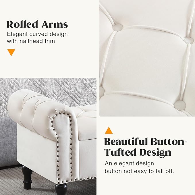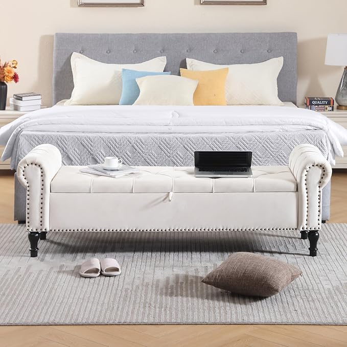 - ELEGANT MODERN STYLE: The storage bench come with 4 wooden legs that provides extra support, more than just an ornament. this long velvet end of bed storage bench with button tufted upholstered flap, exquisite and beautiful. High-density sponge padded and premium velvet fabric, studded trim on the rolled arms make this bench a stylish piece that adds a touch of sophistication to your room.