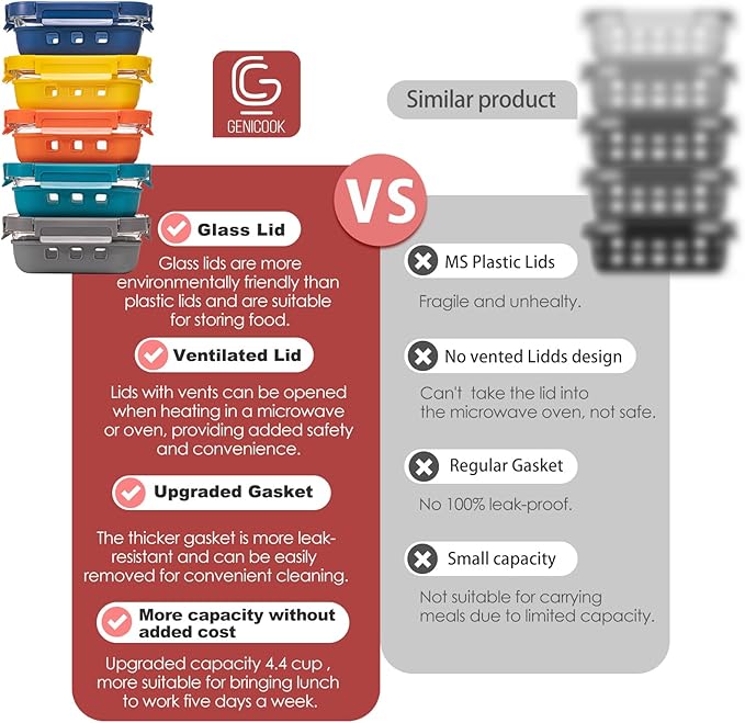 GENICOOK Glass Food Storage Containers With Glass Lids Bento Box Set Lunch Box Eco Friendly Meal Prep Containers Airtight – Plastic Free, Silicon Sleeve Bpa Free 4.4cup/ 5 * 1050ml