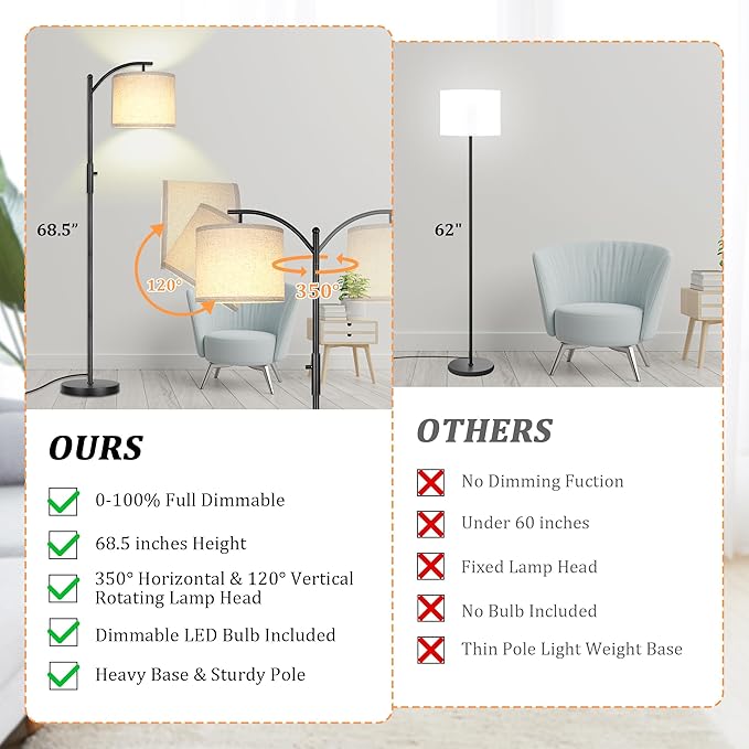- Flexible Lampshade with 350° Horizontal Rotation & 120°Vertical Rotation: 68.5'' arc floor lamp comes with a rotating head that can be rotated horizontally or vertically, assuring convenience for daily life. When you put the floor light behind your couch, you can adjust the lamp shade to any angle you like, which is very proper for reading and working