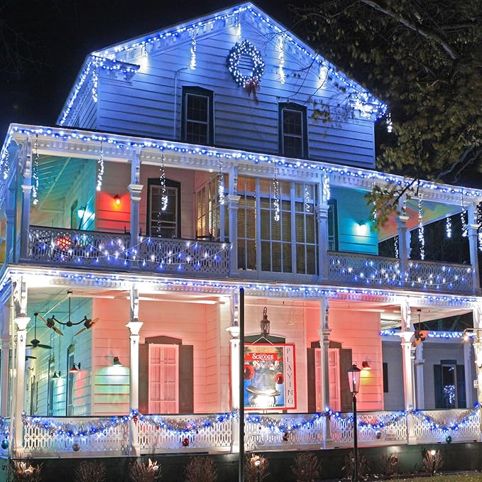 - 8 Lighting Modes: Blue and White Christmas lights with 8 different modes: Combination, in waves, sequential, slo-glo, chasing/flash, slow fade, twinkle/flash, and steady on. Just press the button on the plug to adjust the lighting modes.