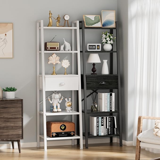 - 【Large Capacity Ladder Bookcase】The ladder shelves features 5 spacious shelves and a fabric drawer,giving you plenty of space for daily necessities,books,plants,decorations,CDs or other items.This storage rack can keep your home neat,tidy and organized,and offer ultimate convenience in household organization.