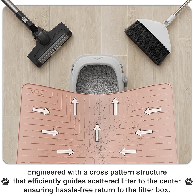 - Easy to Clean: This unique inner pattern ensures that no matter which side you lift the mat, the cat litter naturally flows along the grooves toward the center — making it easy to pour back into the litter box or sweep away with a broom. For quick cleanup, simply shake off or rinse the mat with water to remove any remaining litter, leaving it clean and ready for reuse