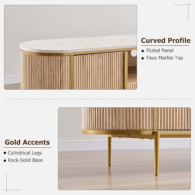 OKD Luxury 70" Fluted TV Stand, Modern Chic Entertainment Center for TVs Up to 80 inches, TV Console with Faux Marble Top, Curved Profile Design, Media Console for Living Room, Natural Oak