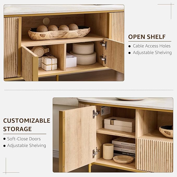 - 70 "LARGE LUXURY TV STAND: The distinctive wave-like fluted panel and Curved Profile Design makes it can be effortless paired with other modern furniture styles. The White/Dark Blue/Natural Oak faux marble top replicates natural marble patterns, maintaining a sense of luxury while reducing weight. Golden metal accents add a touch of visual opulence, and the warm golden tones bring a cozy atmosphere to the room, making it your ideal modern luxury piece for the living room.