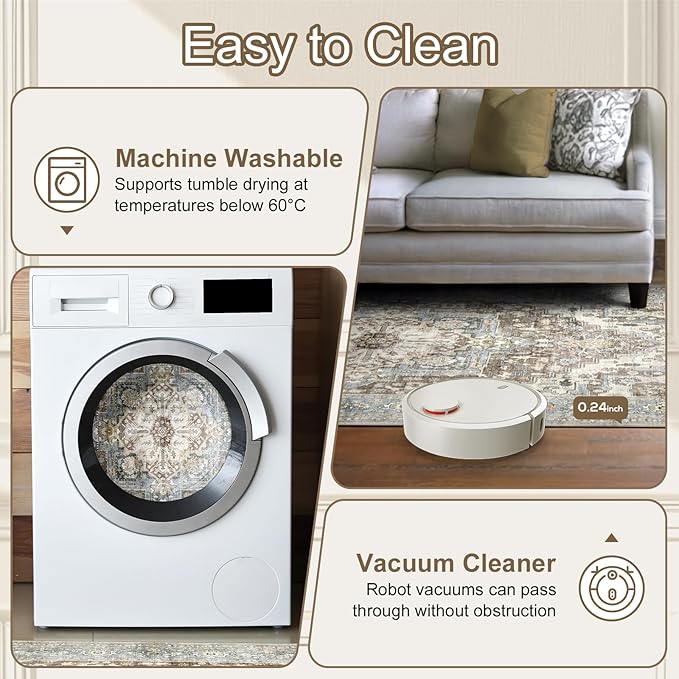 - 【Machine Washable & Easy to Clean】This low-pile rug suits households in various regions and is perfect for all seasons. It can be easily cleaned with a vacuum or carpet brush to eliminate pet hair and dust.The moderate thickness won't obstruct robot vacuums, and it can even be machine washed for a deep clean (supports tumble drying below 60°C)