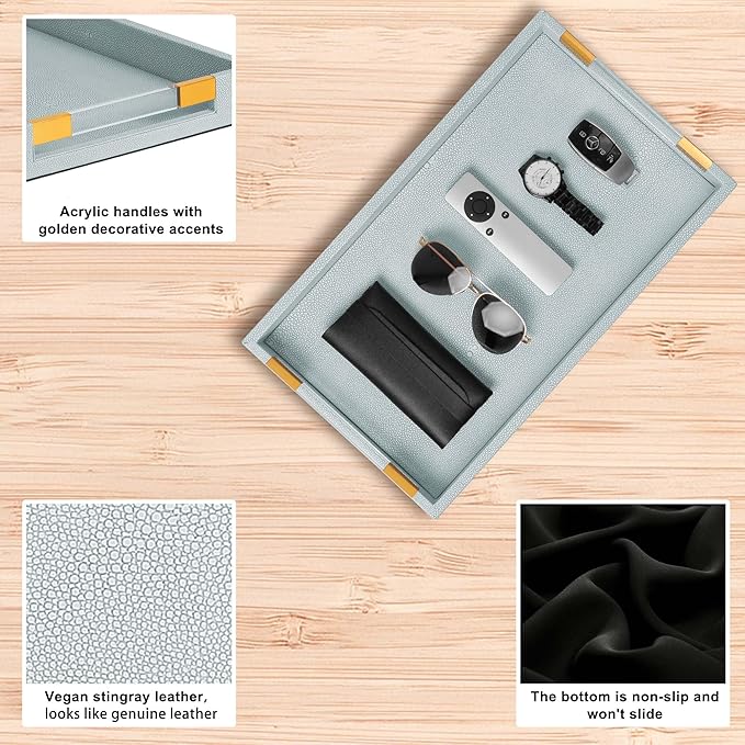 - 【Timeless Leather Tray Design】 Crafted from high-quality vegan leather, this leather tray complements mid century modern decor. The wooden tray wrapped in vegan leather, with non-slip bottom,made of MDF, which is durable and easy to clean. The sleek blue decor accent enhances your living room table decor, making it a must-have for any ottoman coffee table.