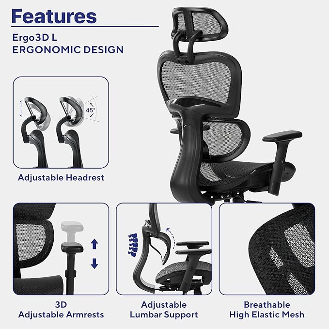 - 【Ultimate Comfort】:The Ergo3DL ergonomic chair is designed for business professionals. It features 4D adjustable armrests to accommodate various sitting postures, and 3D lumbar support to perfectly support your back and waist, reducing spinal pressure.The chair's backrest can be freely adjusted to meet the needs of people with different body shapes, and it can support a maximum tilt of 135°. These personalized designs provide the best comfort experience, allowing you to relax and rest better during your working hours.