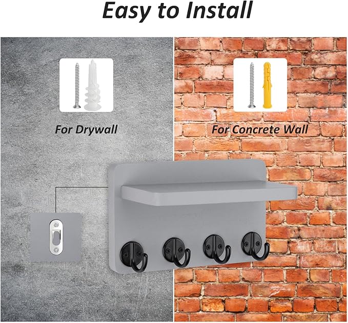 - [SMALL KEY HOLDER] Four sturdy hooks make this small key holder perfect for keys, leashes, handbags, and coats, while the built-in shelf ensures tidy organization of wallets, sunglasses, photo frames and more.
