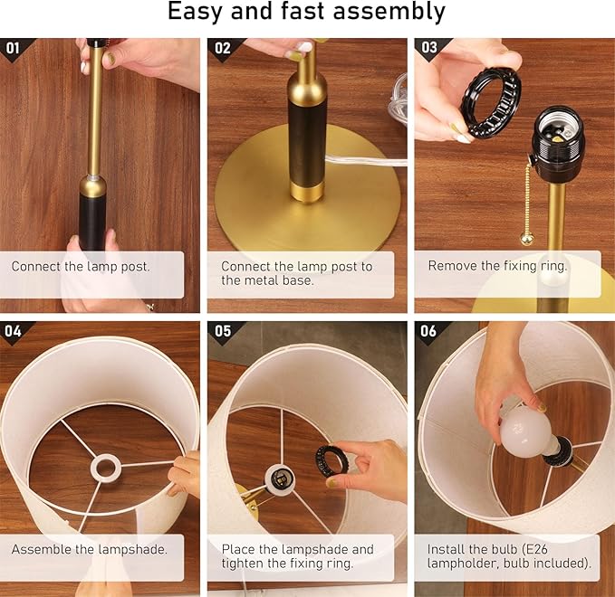 - { ECO-FRIENDLY MATERIAL TO PROTECT EYES - Wooden center column, solid metal round base, grid rubber non-slip pad is stable enough. Linen lampshade with split design, soft light, very easy to assemble