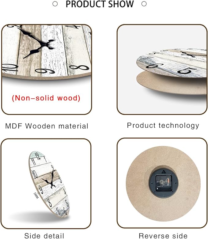 - 2.[Material] - MDF (Medium density fiberboard is an artificial board made of wood fiber or other plant fiber as raw materials, under heating and pressurizing conditions to press the density of 0.50 ~ 0.88g/cm3 board, with good toughness and stability) printed wooden wall clock, clear reading, no glass cover, no frame. Precision quartz movement to ensure accurate timekeeping.