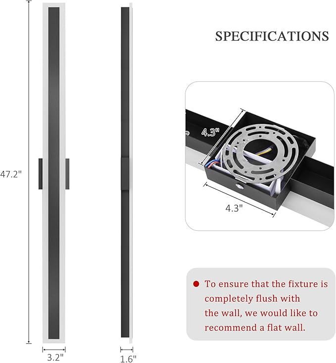 - 【 Upgraded — No More Unsightly Gaps 】 In comparison to other linear outdoor wall lights, LamQee has specially designed 4.3 inch mounting backplate (excluding the 11.8" and 15.8" sizes), to address the issue where the linear shape makes it difficult for the mounting bracket to fully cover and conceal the junction box; this ensures that the wall surface will not awkwardly expose the junction box, allowing for seamless integration with the wall
