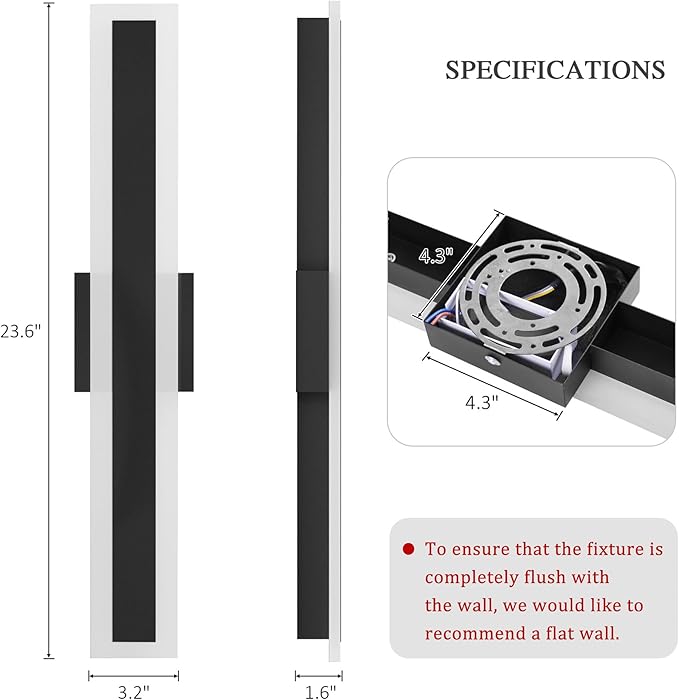 - 【 Upgraded — No More Unsightly Gaps 】 In comparison to other linear outdoor wall lights, LamQee has specially designed 4.3 inch mounting backplate (excluding the 11.8" and 15.8" sizes), to address the issue where the linear shape makes it difficult for the mounting bracket to fully cover and conceal the junction box; this ensures that the wall surface will not awkwardly expose the junction box, allowing for seamless integration with the wall