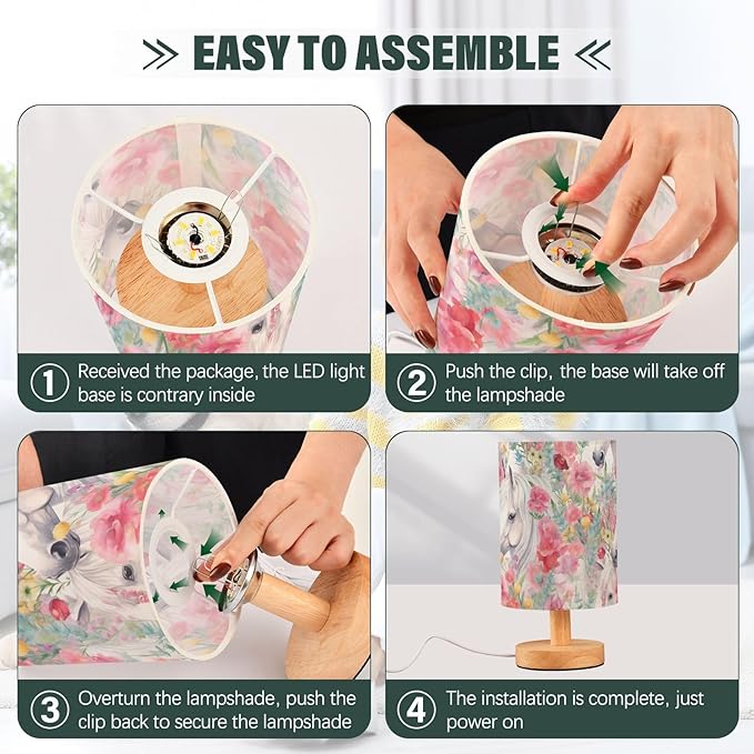 Bedside Lamp White Horse Pink Flower Table Lamp with USB Port Wood Base for Living, 5.12x9.7in/13x24.7cm, 214B3018