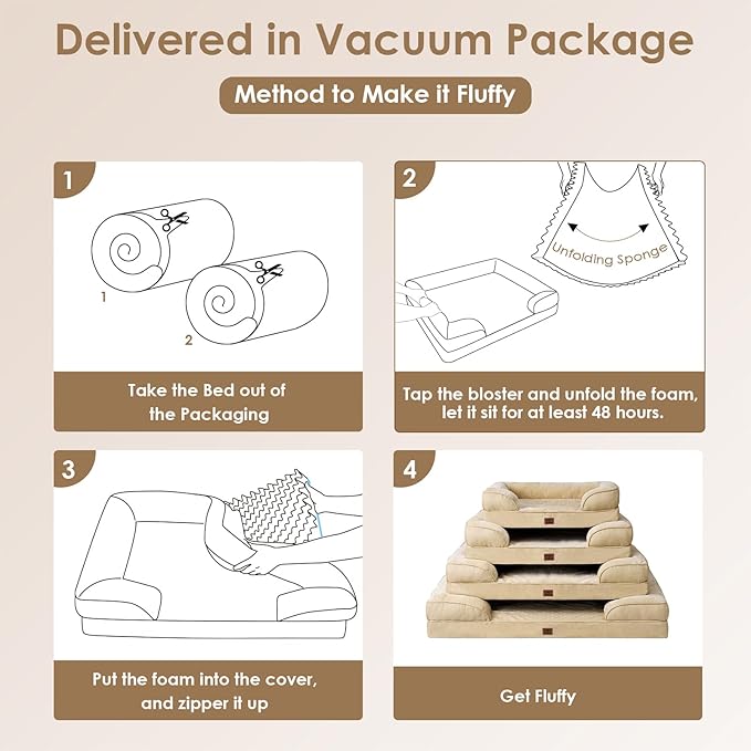 - CARE INSTRUCTIONS: Our dog bed features a removable and washable cover with a zipper closure, making it easy to clean. Remove the foam insert, and the cover can be washed in a machine. Please note that the foam insert is not washable. Allow the bed to expand for 24-48 hours after unpacking.
