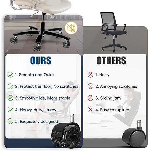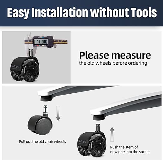 - No-tool Installation: You simply need to remove the old casters, insert Sytopia's caster's metal pin, and immediately experience the quiet gliding and 360° rotation functionality of your office chair. If you are not satisfied with the product you ordered, please feel free to contact us at any time, and we will respond to you as soon as possible!