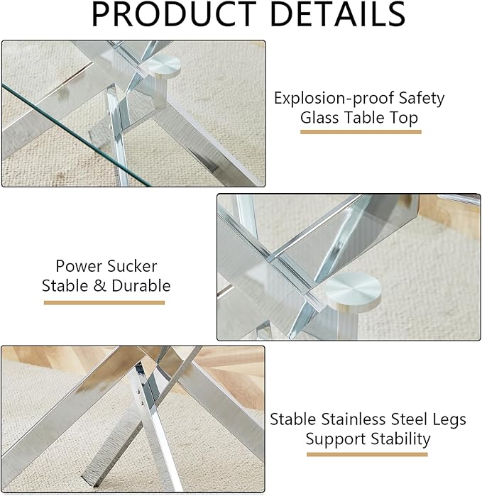 - 【Modern Glass Dining Room Table】The tempered glass dining table is crafted using high-quality materials, ensuring durability and longevity. 8mm thickness of the tempered glass top not only adds an elegant touch but also provides superior strength, making it resistant to scratches and breakage.