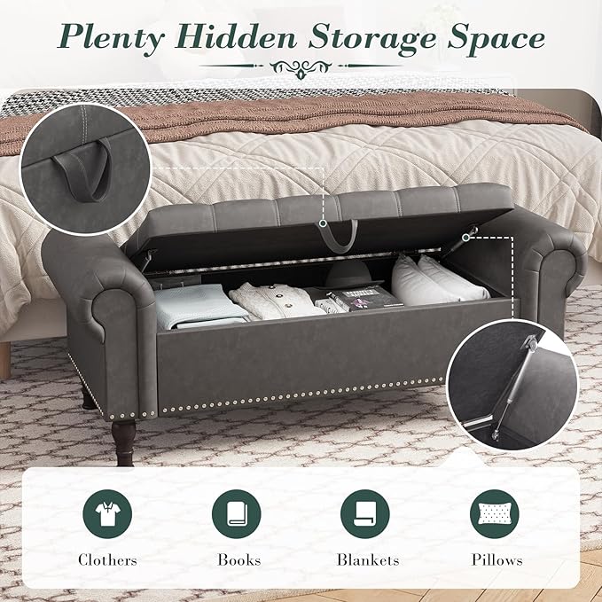 Apicizon 51” Bench with Storage, Upholstered Tufted Button Bedroom Bench with Storage, Faux Leather End of Bed Bench with Rolled Arms, Storage Ottoman Bench for Bedroom, Living Room, Entryway, Gray