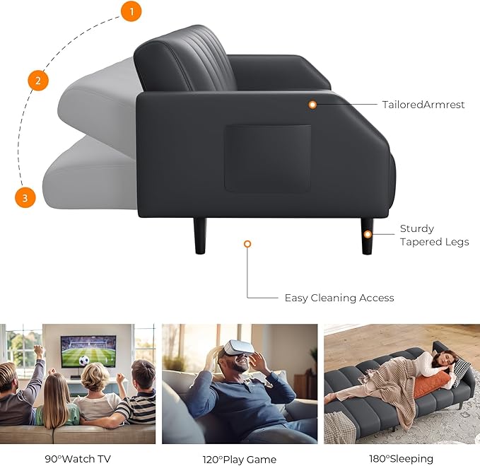 Fadware Faux Leather Couch, Convertible Futon Sofa Bed with Adjustable Backrest, Mid Century Leather Sofa Loveseat with Side Pockets& Metal Leg, Modern Leather Sleeper Sofa for Living Room Bedroom