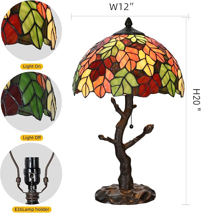 - DESIGN- This is a medium size table lamp, the stained glass lamp shade is patterned with colourful maple leaves entirely, matching with an alike tree trunck base, made of Eco-friendly resin, makes it looks classic and unique. This antique lamp is a perfect addition to your bedroom, living room, office, kids room etc, looks astonishing anywhere you place it.