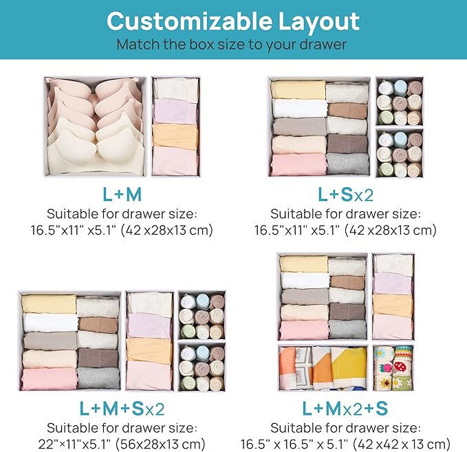 - 【Make Your Clothes More Organized】The largest organizer bins are good for bras, shirt, pants, baby clothes. The medium rectangle bins are good for underwear, lingerie, scarf, baby bibs. The small bins are good for socks, ties, and little stuffs. And the drawer organizers are suitable for closet, dresser, baby room, bedroom and more.