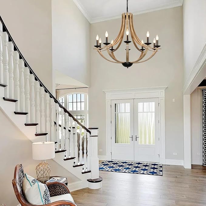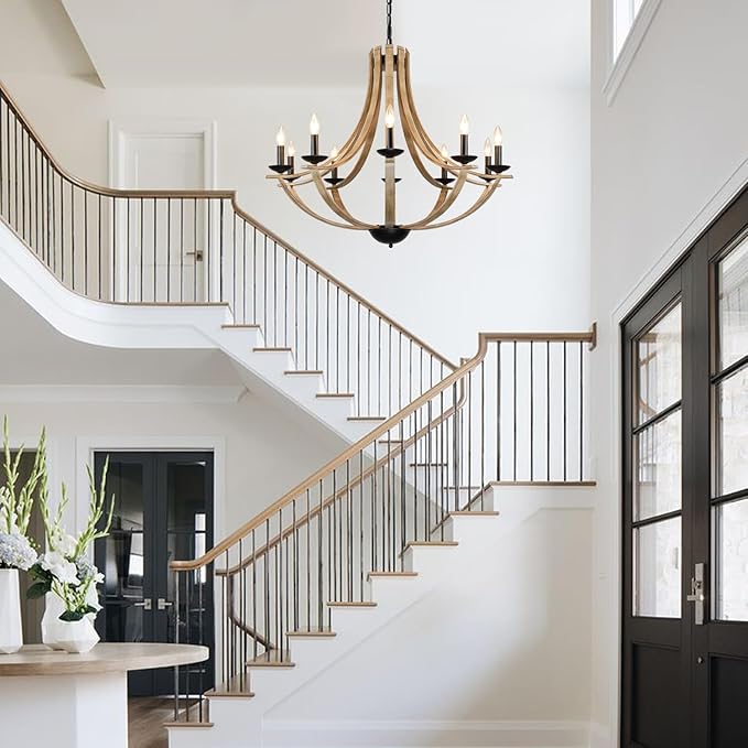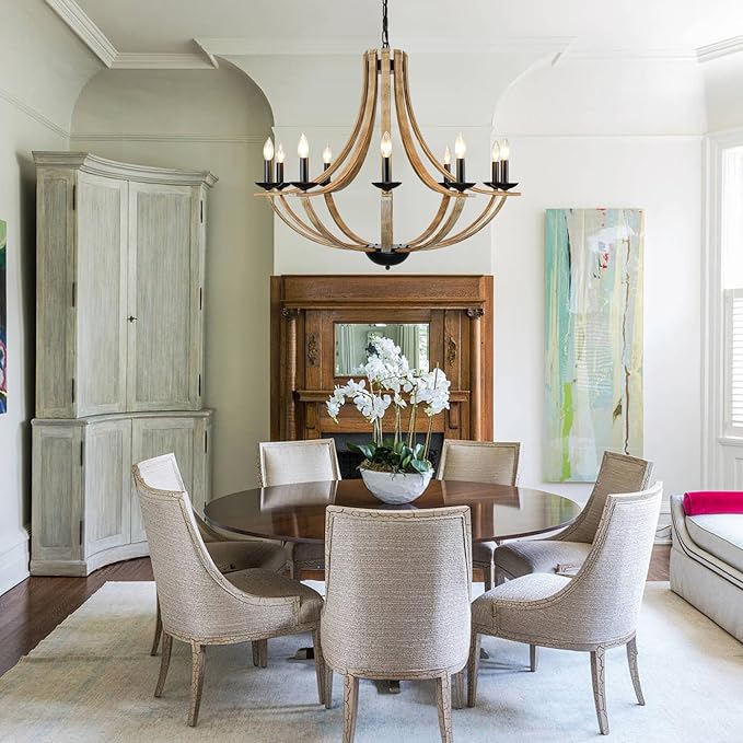 - 【Vintage Farmhouse Design】The 10-lights Farmhouse chandeliers is crafted from metal features a hand-brushed Faux wood grain color. Simple profiled curve profile, Black+retro wood grain finish, so that this dining room chandelier is full of modern farmhouse. for dining rooms, living rooms, kitchen islands, entryways, hallways, kitchen islands