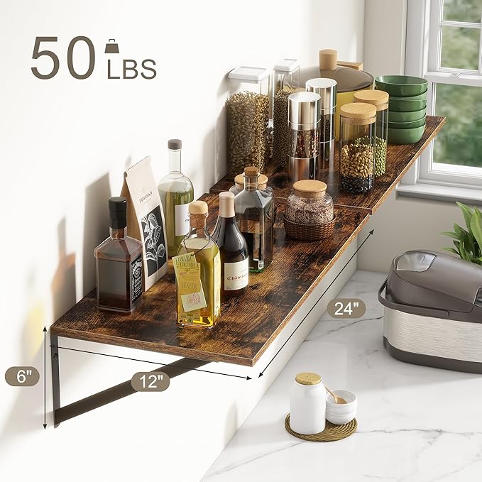 - 【FARMHOUSE RUSTIC WALL SHELF】These floating shelves are made of premium engineered wood board and visible triangular bracket. The rustic wooden grain surface add character and warmth to any modern or traditional interior with these deep floating shelves, contrast shelves at staggering heights on the wall or mount side-by-side or in the corner for a clean streamlined look.