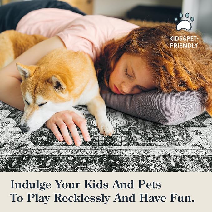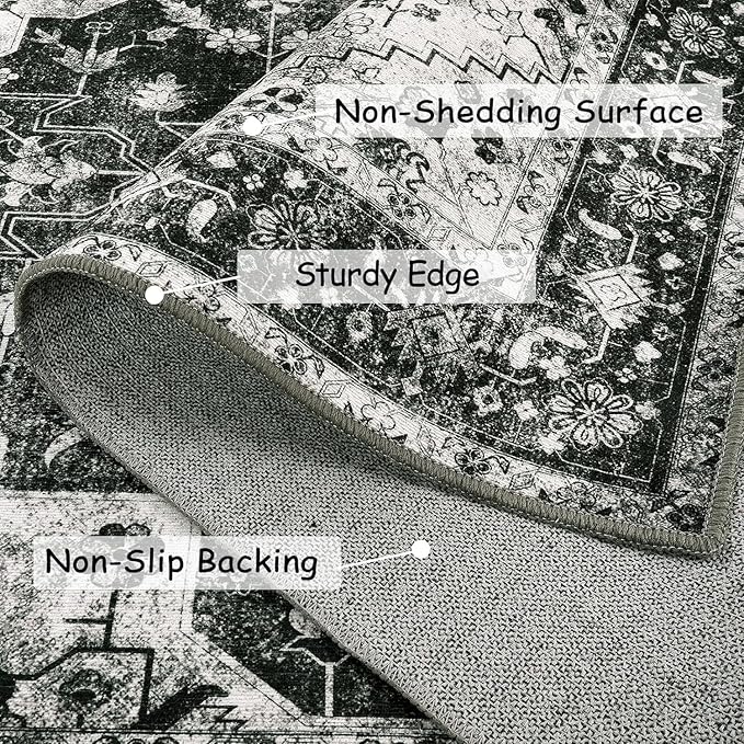 Moynesa Ultra-Thin Washable Area Rugs 8x10 Black and White Rugs for Living Room, Boho Large Rugs for Bedroom Non Slip Lightweight, Vintage Low Pile Carpet for Dining Room Home Office Decor