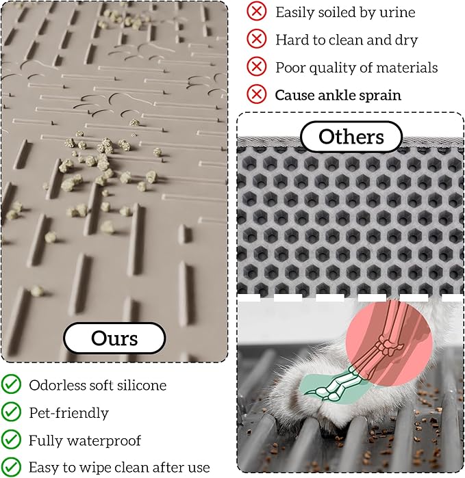 - Premium Grade Silicone:Non-porous and waterproof silicone prevents odor and stains from setting in. This cat litter mat feels soft and gentle to the touch. Its durable material allows the mat to bounce back to its original shape effortlessly, even after repeated folding.