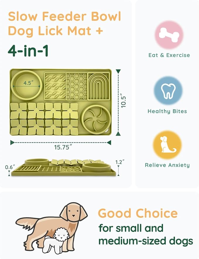 - UPGRADED 4-IN-1 FEEDER: Our multifunctional slow feeder dog bowls includes a slow-eating bowl, a water bowl, a snuffle area, and a 3-pattern lick area. Designed to cater to all your pet's needs in one innovative solution, it accommodates different food types and is ideal for most dogs' daily eating and play activities.
