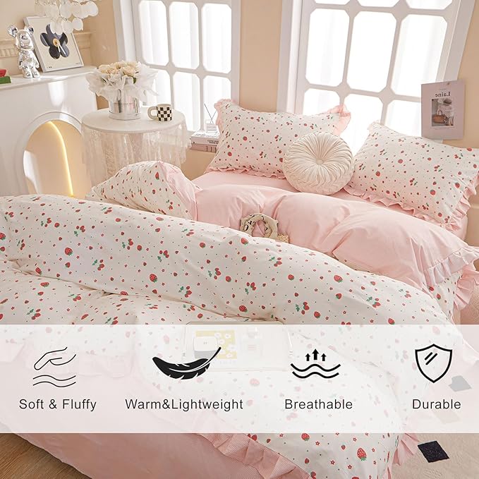 - Aesthetic Strawberry Comforter Set: The french ruffled comforter set with cute strawberry pattern printed, add color and beauty and elegance to bedroom, it exhibits a simple yet exquisite aesthetic, perfect bedding set for homeowners with sophisticated tastes in cottage core room decor. The cute strawberry bedding set is suitable for bedroom, guest room, school dormitory and so on
