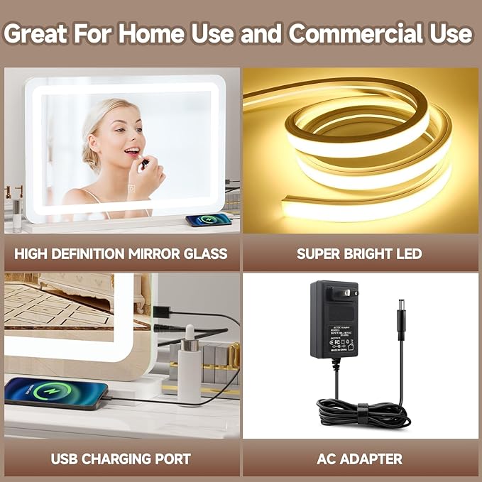 • ✅Suitable for Home and Commercial Use: This LED vanity mirror caters to both personal and commercial needs, making it perfect for use in hair, makeup, and beauty salons. It is also an excellent addition to any home setting, adding a touch of luxury and practicality to any space.