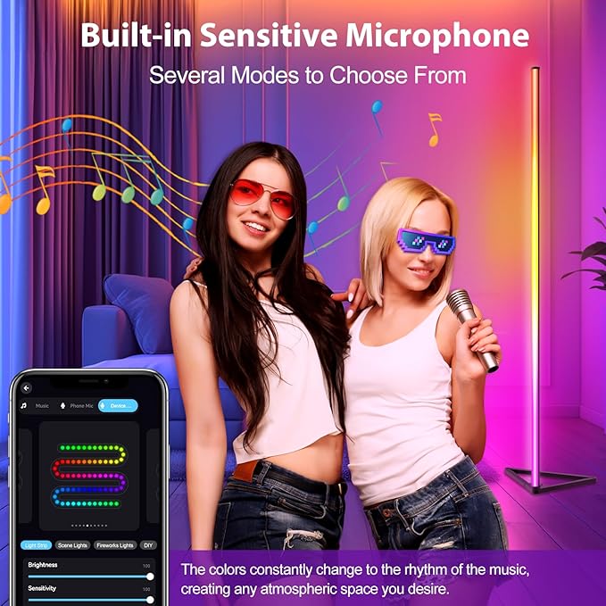 - 【Group control,music synchronization】This RGBIC floor lamp dimmable can control multiple corner lights separately to achieve different light outputs. You can also link multiple LED standing lamps and control them via the APP to perform light shows at the same time. Features a highly sensitive microphone that detects music and ambient sounds and synchronizes lights with music and movies. An immersive audio-visual experience creates a romantic and cheerful atmosphere.