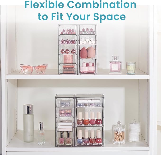 - 4 Set Desk Organizer with 16 Drawers: The 4-pack clear drawer storage boxes (with a total of 16 drawers) maximize the use of space on desks, vanities and bathroom countertops. Each storage box can hold various small items, from office desk accessories to cosmetics, for easy access. You can place them side by side or separately in different areas.