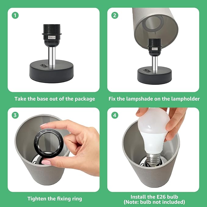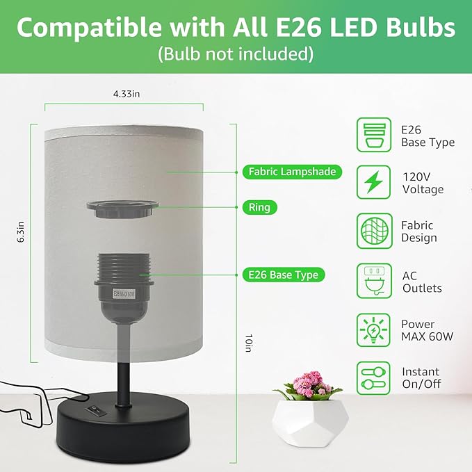 - 【Instant On/Off 】This lamps for night stands comes with an instant on/off switch and AC outlets(2-prong), plug and play, one-button switch, easy to install and use. Please note that bulbs are not included. (Please use the LED bulb, max watt of the LED bulb is 60W)