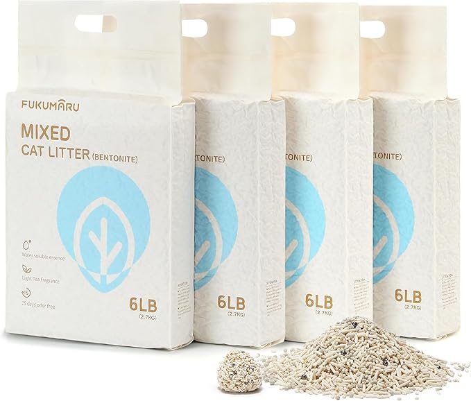 FUKUMARU Mixed Tofu Cat Litter, Strong Clumping Cat Litters, Effective Oder Control, Dust Free and Ultra Absorbent Flushable Bentonite White Tea Cat Litter, Direct to Toliet, 24 LB(4 Packs)