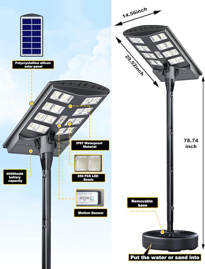 - 【IP68 Waterproof and Wireless Design】The solar floor lamp outdoor adopts high-quality material, which is lightning-proof, rain-proof, oxidation-proof and anti-exposure. This parking lot lights are safe & sturdy, lighting your way home.Perfect for street and roads, garage, garden, street, courtyard, yard and squares, etc