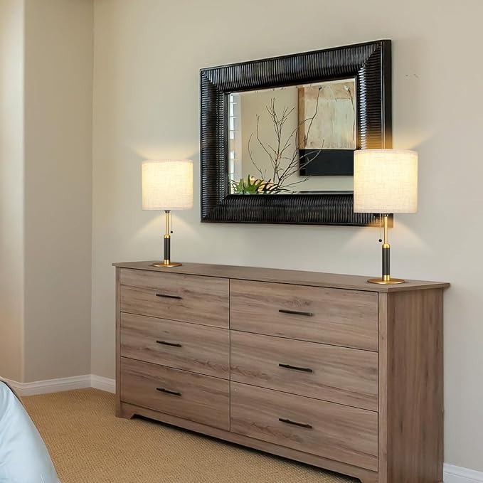 18.9" Set of 2 Small Vintage Table Lamp Bedside Lamps for Bedroom Nightstand Lamp for Living Room 3-Color Temperatures Pull Chain Wood Fabric for Home Office Dorm Decor (Light Brown+Brass)