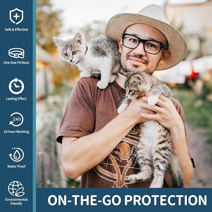 - Non-Greasy & Water-Resistant:Our flea collar for cats are water-resistant, allowing your cat to enjoy baths, swims, or walks in the rain without worry. The non-greasy formula is easy to handle, leaving no residue on your cat's fur or your hands.